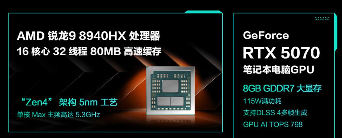 硬件配置方面,本次限时优惠的天选6 Pro锐龙版核心配置为锐龙9 8940HX+RTX 5070款。其中,锐龙9 8940HX是主流价位中非常经典的高端移动CPU,采用Zen 4架构与5nm制程工艺打造,具备16大核32线程的豪华规格,单核最高加速频率可达5.3GHz,具体到天选6 Pro锐龙版身上,该机散热模组为双层风扇结构+内吹技术2.0设计,具备90W稳定性能输出,在Cinebench R23多核测试中能跑到33000分左右,非常强劲,这样的性能表现,搞定日常使用轻松愉快,应对大型游戏和专业应用也都不在话下。