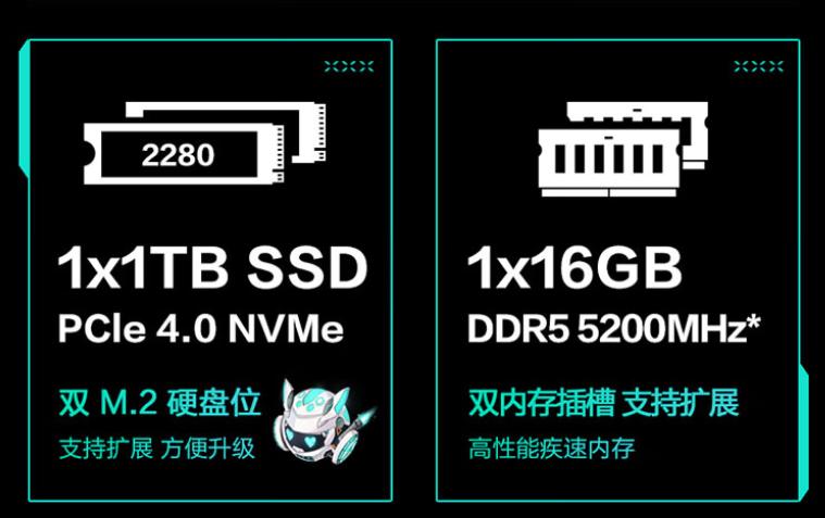 存储组合则是1×16GB DDR5内存+1TB PCIe4.0 SSD,满足日常使用和游戏娱乐需求,该机预留了内存插槽和M.2 SSD硬盘位,方便用户自行升级。