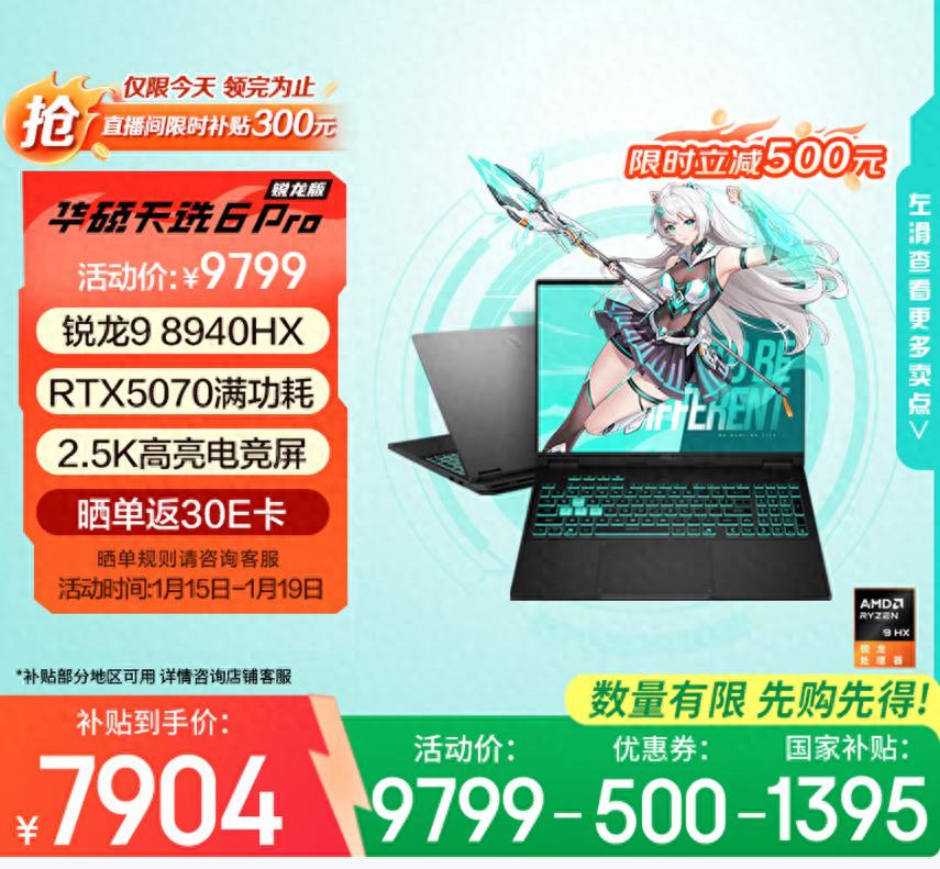 2026年的电子产品国补已经推出,已有多款机型开启了国补优惠。之前牛叔分析今年买笔记本时,提到今年游戏本是早买早享受,有好价就可直接下手——目前华硕爆款游戏本天选6 Pro锐龙版限时好价来袭:RTX 5070款可享限时大额补贴,直降800元!更可享国家补贴,补上加补立减2150元!到手价仅需7659元!数量有限,售完即止!感兴趣的小伙伴别错过。
