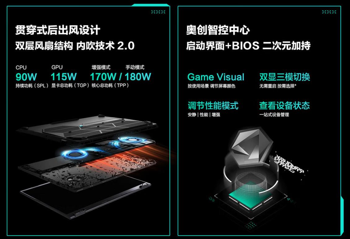 同时,增强模式下,天选6 Pro锐龙版具备170W的整机性能释放,手动模式下则支持180W功率输出。另外,该机内置的奥创智控中心便捷易用,散热模式切换方便,增强模式/性能模式/安静模式可在不同使用场景随心切换,全能匹配高能游戏场景和日常低功耗低噪声使用需求。