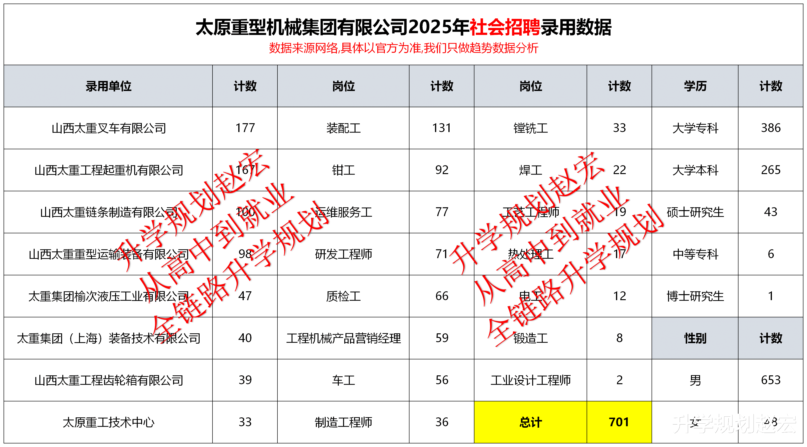 总共701人,男生653人,女生45人。从学历上来看,大学专科386人,大学本科265人,硕士研究生43人,中专6人,博士研究生1人。招录单位有山西太重叉车公司177人,山西太重工程起重机公司167人,山西太重链条制造公司100人,重型运输装备公司98人,下面还有4家单位都是40人左右。岗位人数最多的是装配工131人,钳工92人,运维服务工77人,研发工程师71人。研发工程师和营销经理这些岗位录用年龄要大一些,同样要求也高一些,最大的有1977年的。看到岗位和学历,接下来就知道院校人数最多的类型了。同样对于工程师类的岗位,校招当中会更多。