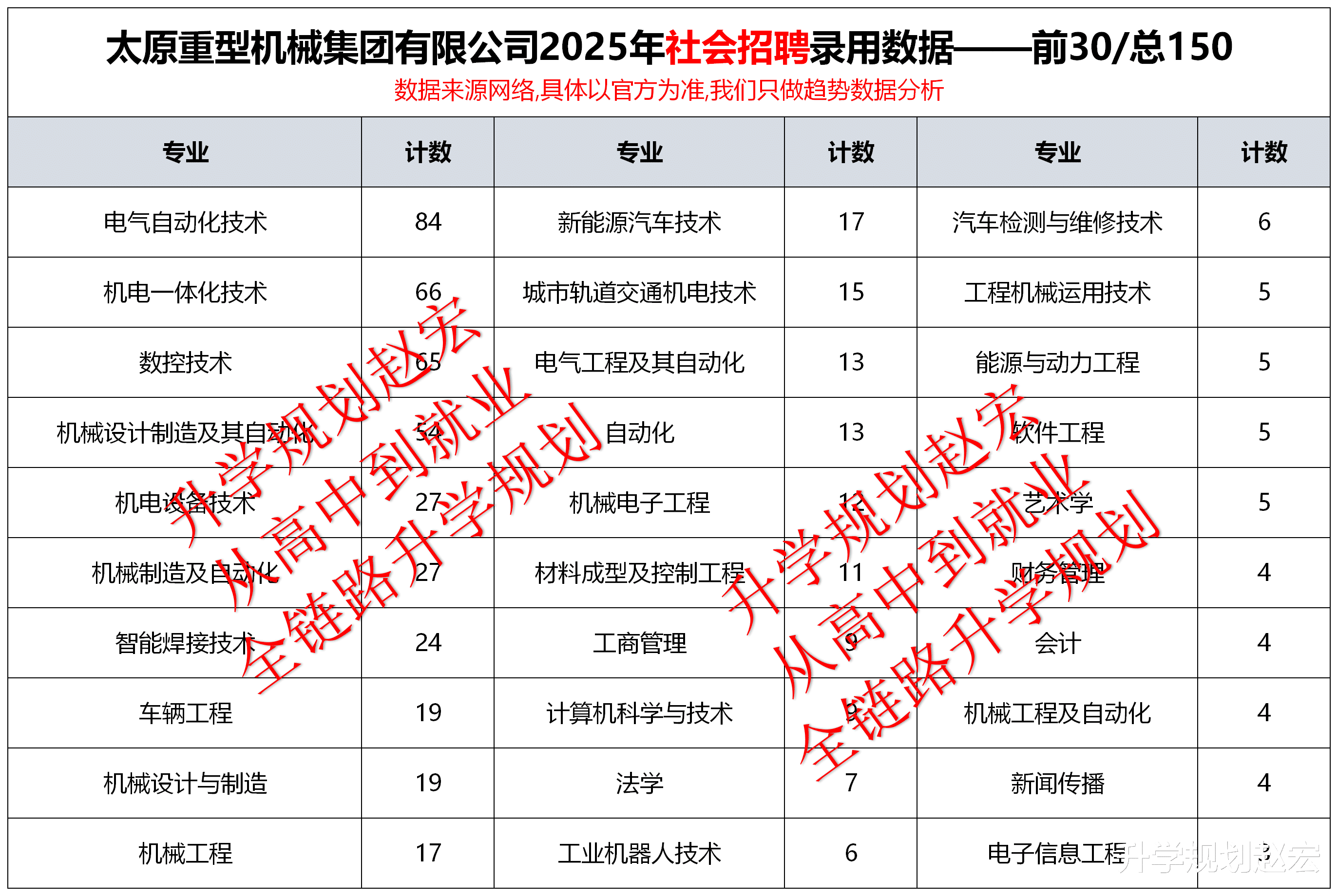 每年我们都会更新很多的就业数据,基本上都是本科学历以上的,同时也基本上是校招为准。社招非常少,专科的也比较少,一个原因还是社招基本上不咋公布信息,还有就是社招和校招差异比较大。对于院校和专业不错的同学来说,校招才是关键。虽然少,我们还是也更新一些,大家对比着看看。那本文咱们来看看太原重型机械集团2025年社招录用数据,总共701人,大专有386人,人数最多的是山西机电职业技术学院,断层领先,专业最多的是机械和电气。除了社招外,太重集团2025年校招录用是288人,如果大家感兴趣,可以留言,我们后面更新。同样其他央国企单位的近3年数据咱们放到了央国企体制内就业知识库中,知识库里面是详细的名单。央国企可是大家非常喜欢的呀。
