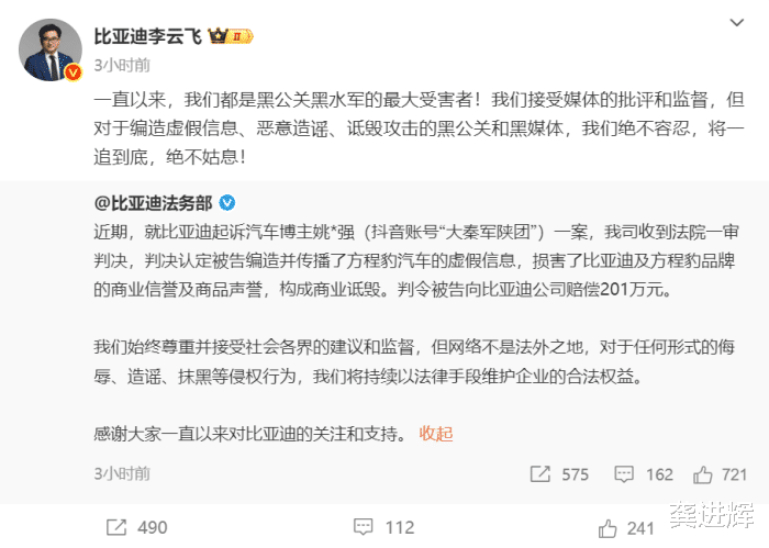 经法院强制执行,判赔金额201.87万元已执行到账,且“龙猪-集车”及相关账号的实控人向比亚迪予以书面致歉。当时,李云飞表示,“比亚迪到了现在的位置和体量,如果有媒体就客观事实进行报道批评,都没问题!有些媒体不了解情况,有些误解性的发布,我们也能接受!但对于黑公关、黑媒体,为了黑而黑,长期针对比亚迪,诋毁比亚迪,我们绝不容忍!”