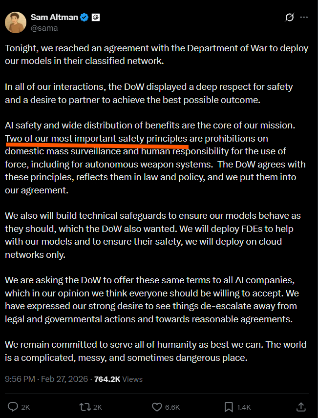 另一方面,OpenAI这波操作太没立场,也太让人寒心。之前它还公开帮Anthropic说话,反对美军无限制用AI,结果Anthropic因为坚守底线,被美国封杀之后,OpenAI转头就“截胡”了这个合同,这种投机取巧的做法,不光让93名OpenAI员工联合谷歌员工联名抗议,连海外用户都看不下去,担心AI会被做成武器,加剧冲突。