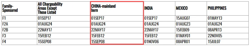F1:公民21岁以上未婚子女类别,表A前进123天,排期来到2017年9月1日;表B大幅前进213天,来到2018年10月1日。