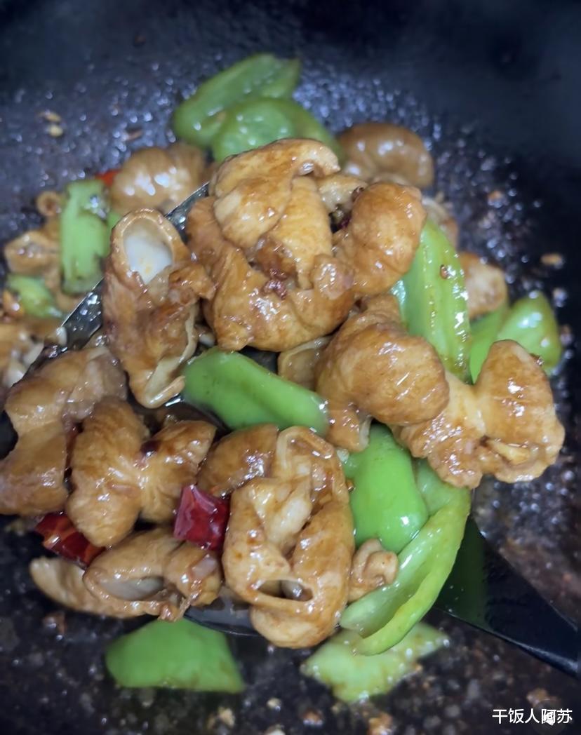 然后,放入切好的青椒块。青椒不宜炒太久,否则会失去脆嫩的口感并变得软烂发黄。因此,要用大火快炒,翻炒至青椒表面出现虎皮状、断生即可。此时,青椒的清香与肥肠的浓郁香味完美融合,视觉上也更加诱人。
