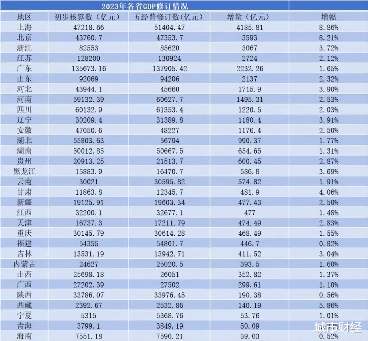 而且,广东、江苏、浙江的上调规模比山东还大,广东调整了2232.26亿元,江苏调增了2724亿元,浙江调整了3067亿元。
