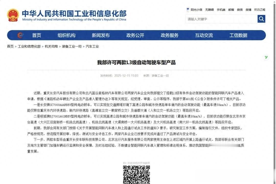 2024 年 12 月 15 日,工信部正式发放国内首批 L3 级有条件自动驾驶车型准入许可,长安深蓝 SL03、极狐阿尔法 S 两款纯电车型脱颖而出,在北京、重庆的指定高速及快速路启动试点。这一举措不仅标志着中国自动驾驶从 “技术验证” 迈向 “规模化应用”,更直接关系到千万车主的未来出行选择 ——L3 到底比 L2 强在哪?现在能体验吗?个人购车还要等多久?本文结合行业动态与车主需求,进行全方位解析。