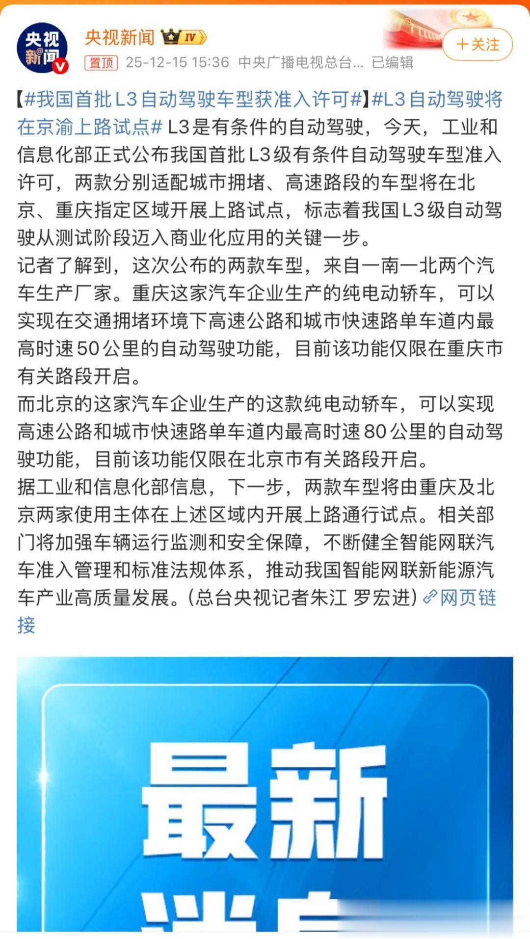 五、自动驾驶分级通俗科普(车主必备)L1(辅助驾驶入门):定速巡航、车道保持单一功能,手脚不可脱离控制L2(组合辅助驾驶):同时控制转向 + 加减速,需实时盯防路况(主流新能源车型标配)L3(有条件自动驾驶):特定场景系统自主驾驶,仅需响应接管提醒(本次落地级别)L4(高度自动驾驶):限定区域内无需接管,无需驾驶员(当前仅封闭园区应用)L5(完全自动驾驶):无方向盘设计,全场景自主驾驶(技术仍在研发)结语:L3 落地,不止是技术进步,更是出行方式革新首批 L3 自动驾驶的获批,不仅让中国在全球智能汽车赛道占据重要席位,更给车主带来了切实的出行便利 —— 拥堵路段解放双脚、高速行驶降低疲劳。虽然目前仍有场景、时间限制,但 2026 年 C 端车型的投放已近在眼前。