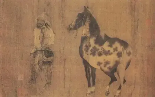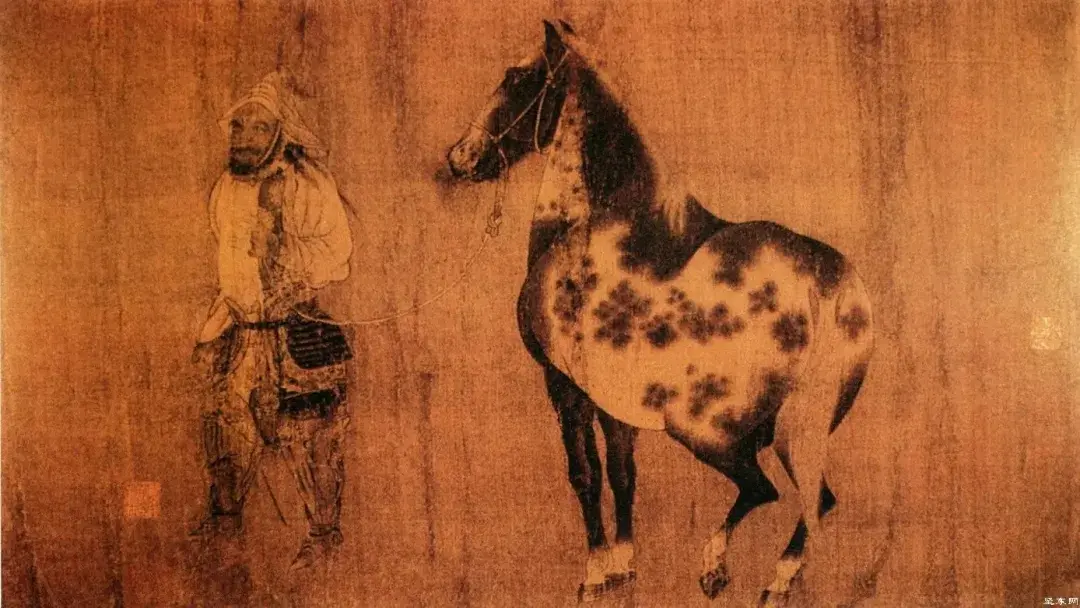 从文化视角观之,《调马图》堪称多元文明交融的视觉见证。胡人深目高鼻的形象、马匹西域良驹的体征、鞍具上的联珠纹饰,无不映射出丝绸之路上活跃的文化交流。较之唐代鞍马画的丰腴华贵,此作更添几分北地苍劲;相较于宋代李公麟的白描文人趣味的《五马图》,它仍保留着唐代壁画般的浓郁色彩与装饰性,恰如五代本身——一个在废墟上重组美学的特殊时代。