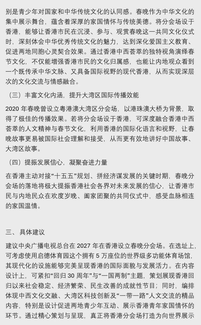 关于在香港设立春晚分会场,霍启刚代表在建议中陈述了四个理由。四个理由分别是:契合国家战略,展现香港桥梁作用;强化文化认同,搭建爱国主义教育与情感融合的重要平台;丰富文化内涵,提升大湾区国际传播效能;提振发展信心,凝聚奋进力量。