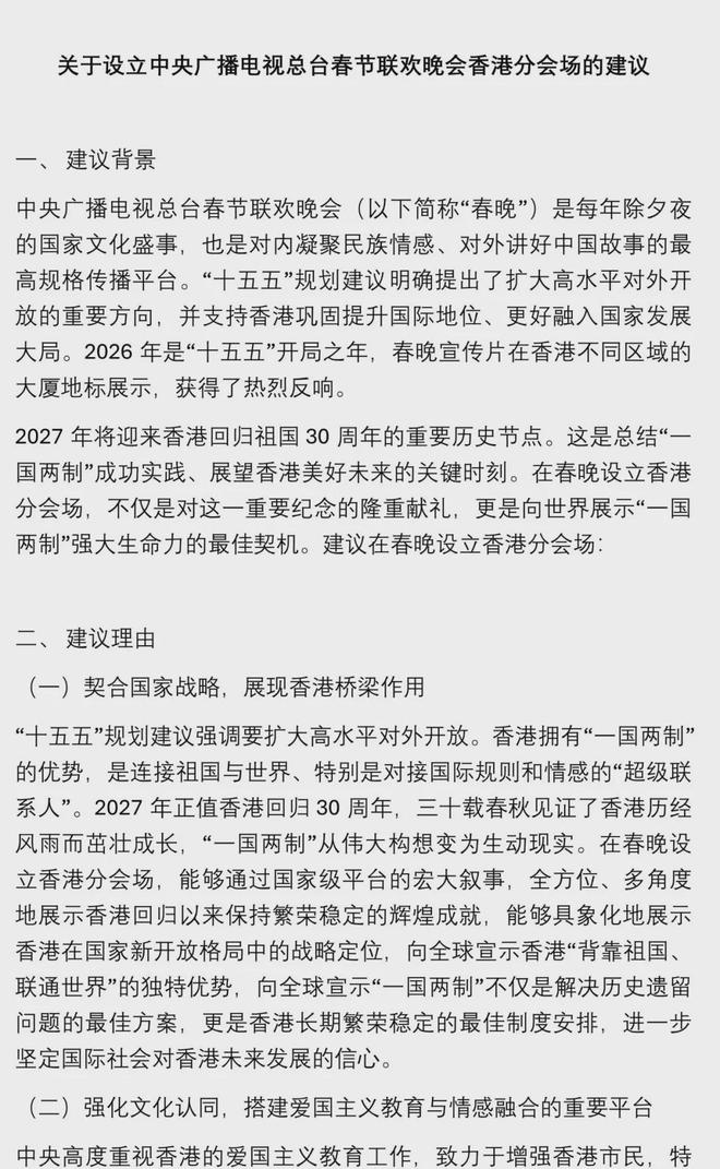在“建议”中,霍启刚代表表示,2027年将迎来香港回归祖国30周年的重要历史节点。在这一总结“一国两制”成功实践、展望香港美好未来的关键时刻,建议“在春晚设立固定的香港分会场”。