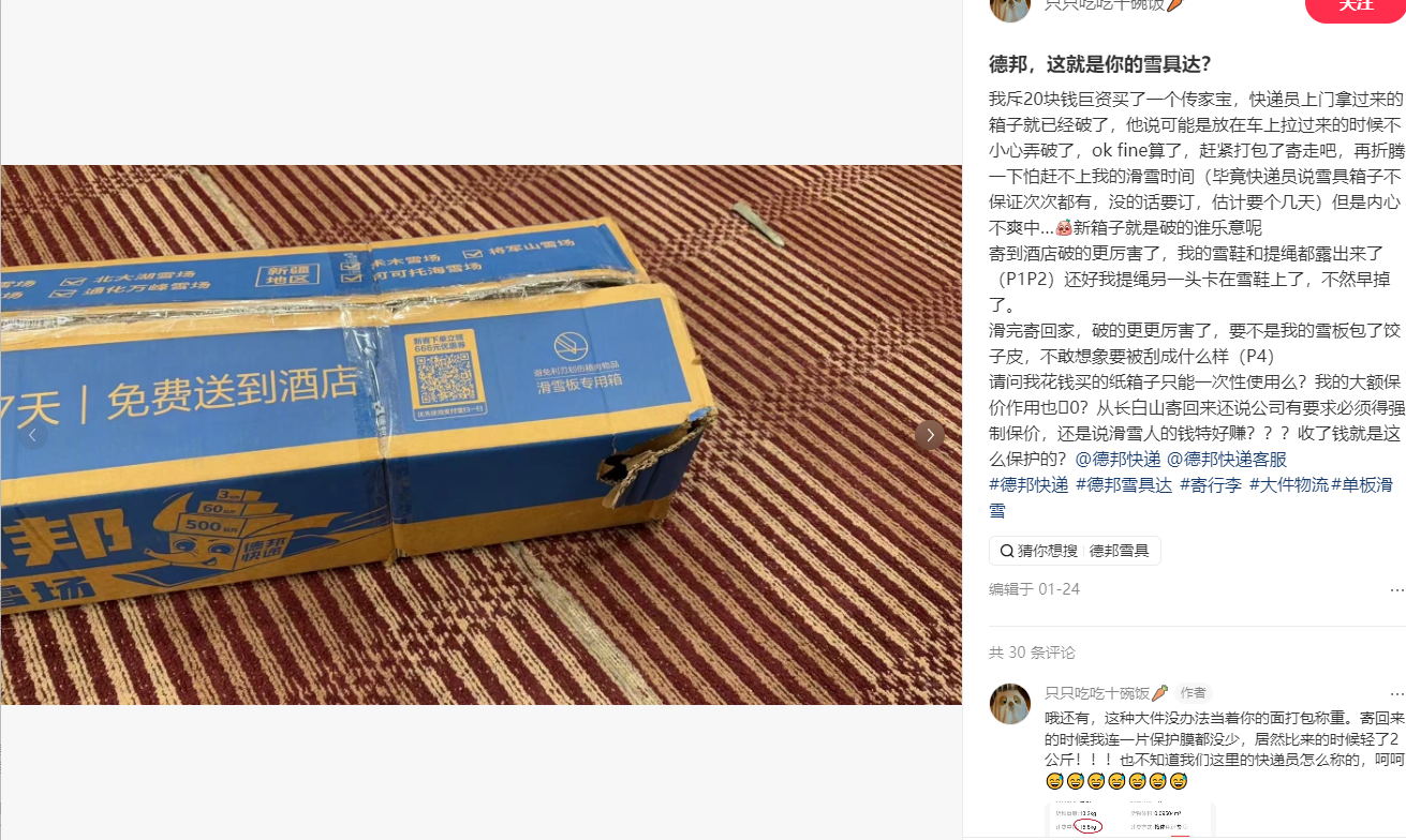 网友只只吃吃十碗饭表示,“在用德邦快递的‘雪具达’寄雪具时,快递小哥上门包装的箱子是破损的,为了不耽误时间,便对这一小破损没在意,但是寄到目的地后,箱子破损的更厉害,雪具露在外面,一不小心,就会遗失里面的物品。”