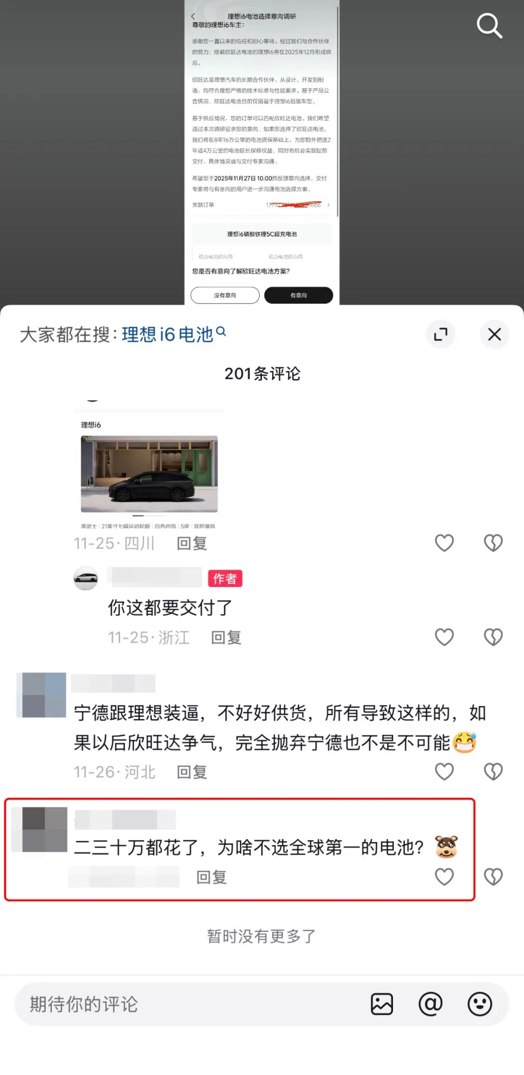 市场正在以最真实的方式回应这一策略。一位i6的准车主在社交平台上的留言引发了很多人的共鸣:未来几年的用车过程中,都不想在充电时、冬天续航打折时、甚至在卖车时,心里冒出一丝“如果当初选宁德时代就好了”的念头。