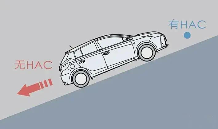 车辆在陡峭或光滑坡面起步时,驾驶员从制动踏板切换至油门踏板车辆将向后下滑,从而导致起步困难,为防止这种情况,这时HAC可以控制暂时(其实就2秒)对四个车轮试驾制动力以阻止车辆下滑。