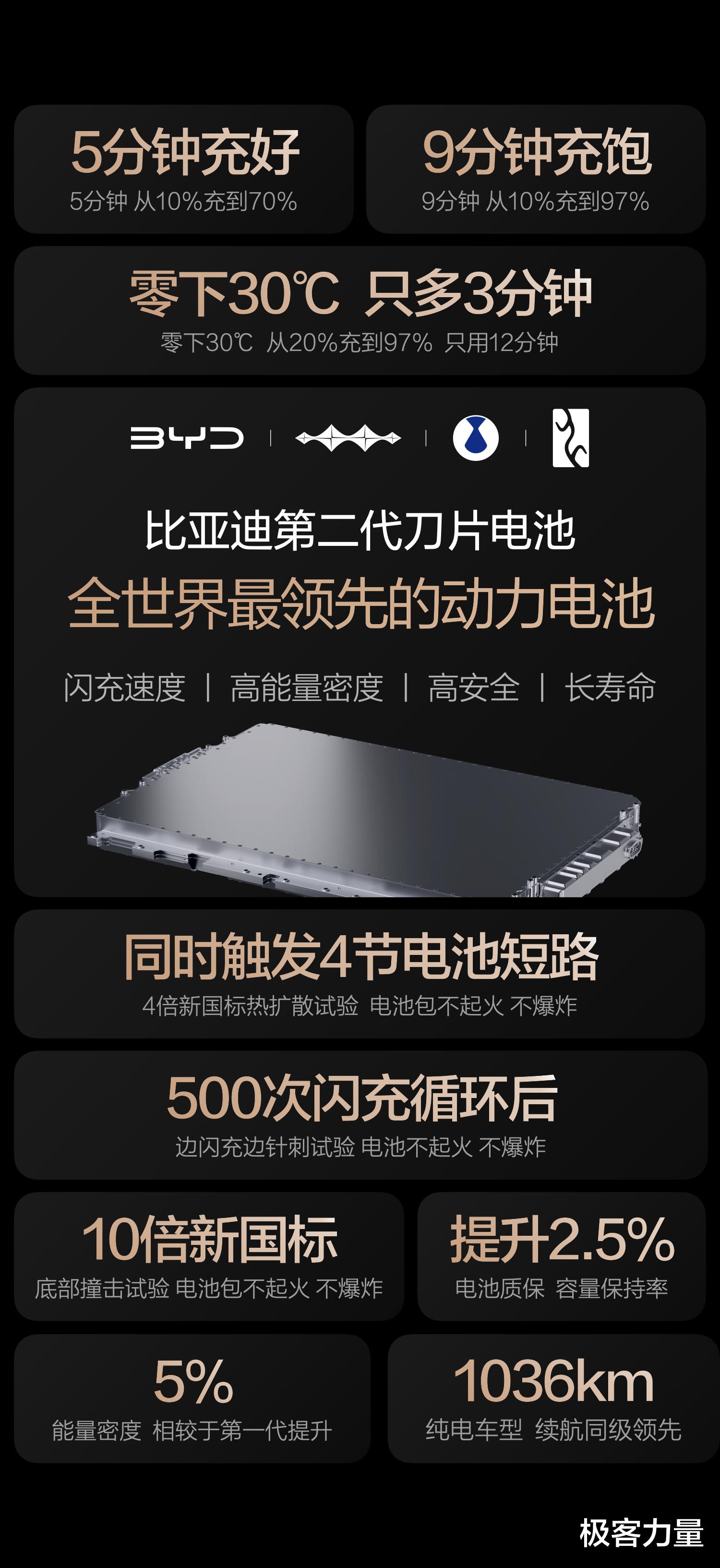 3月5日,比亚迪正式发布闪充中国战略,同步推出第二代刀片电池与全新闪充技术,硬核闪充技术树立行业新标杆,一举创下全球量产新能源汽车最快充电速度纪录。该技术实现常温环境下5分钟完成核心补能、9分钟即可满电,即便是零下30℃的低温工况,充电耗时也仅比常温多3分钟,精准破解了新能源汽车行业长期存在的充电慢、低温补能效率低两大核心痛点。