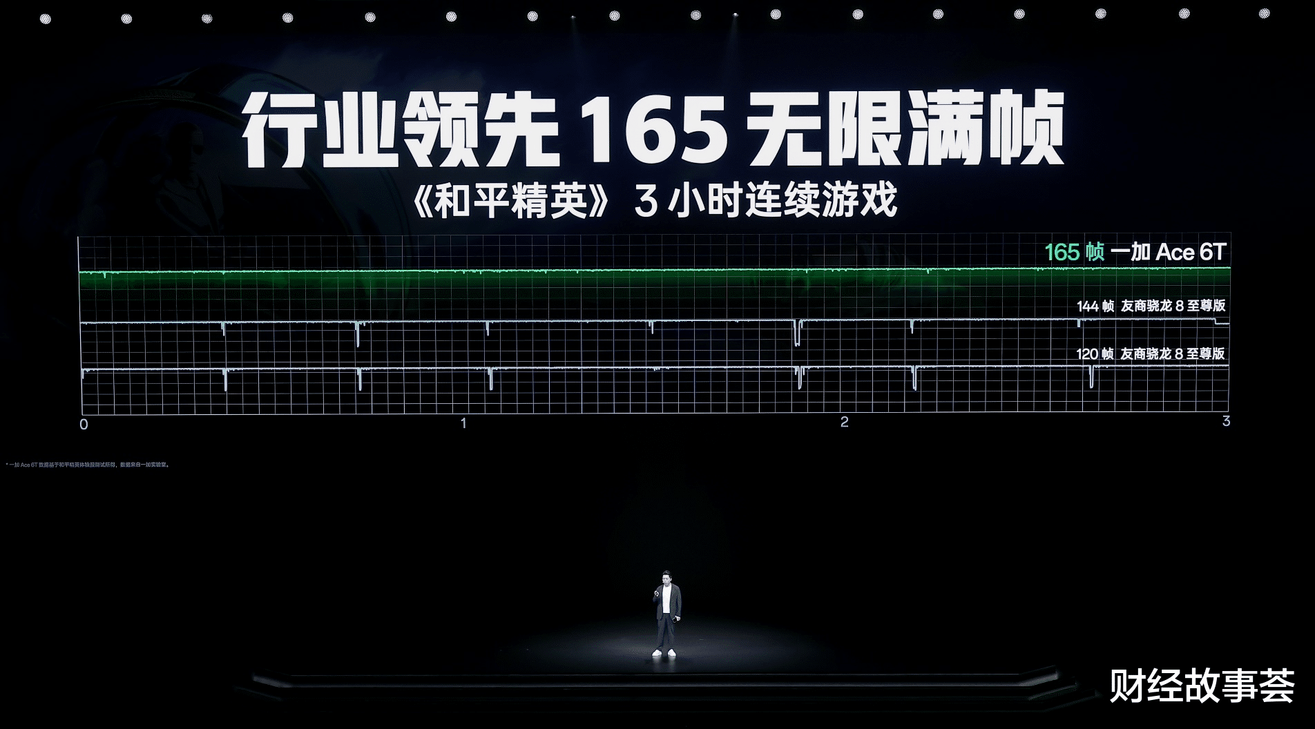 一加Ace 6T将独家自研的全新一代「风驰游戏内核」写入第五代骁龙8芯片底层,充分释放这颗芯片全部性能,大幅提升游戏表现。在风驰游戏内核的加持下,一加 Ace 6T可以轻松驾驭 165 超高帧游戏,实现同档唯一 165 无限满帧游戏体验。相比主流手机的120帧,一加Ace 6T的165 超高帧游戏每秒画面显示数量多45帧,画面显示速度提升27%,全链路操作时延缩短10ms,每秒操控速度提升17%,操作响应快人一步,不仅提高了游戏的流畅性,也提高了游戏的胜率。实测显示,一加 Ace 6T连续运行《和平精英》3小时,帧率持久流畅,帧率稳定性优于同等环境下友商骁龙8至尊版机型的120帧或144帧游戏表现,且在1% Low帧表现上也做到引领。