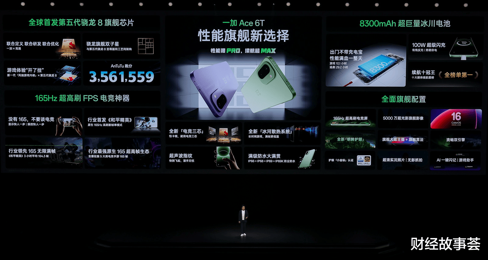 2025 年 12 月 3 日,一加正式发布「性能旗舰新选择」一加 Ace 6T。作为一加Ace系列全新力作,一加 Ace 6T全球首发搭载第五代骁龙8移动平台,写入独家自研「风驰游戏内核」,实现同档唯一 165无限满帧表现,并配备行业唯一8300mAh超巨量冰川电池与100W超级闪充的超强续航组合,更有ColorOS 16流畅系统、IP66 /IP68/ IP69/IP69K满级防尘防水等全面旗舰配置,实力强悍。一加还带来一加 Ace 6T原神神里绫华定制机,以神里绫华为灵感,在手机外观设计、专属珍藏礼盒、专属系统主题等进行全链路深度定制,为《原神》粉丝与玩家献上最真挚的礼物。