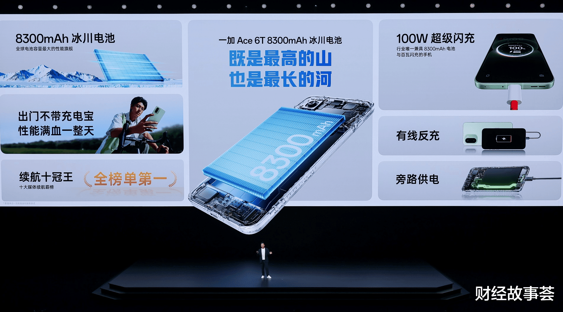 一加 Ace 6T配备8300mAh 超巨量冰川电池,支持100W超级闪充,是行业中唯一兼具8300mAh 电池和百瓦闪充的机型,续航实力异常强悍,霸榜10大专业科技媒体续航实测榜单榜首,成为当之无愧的“续航十冠王”。