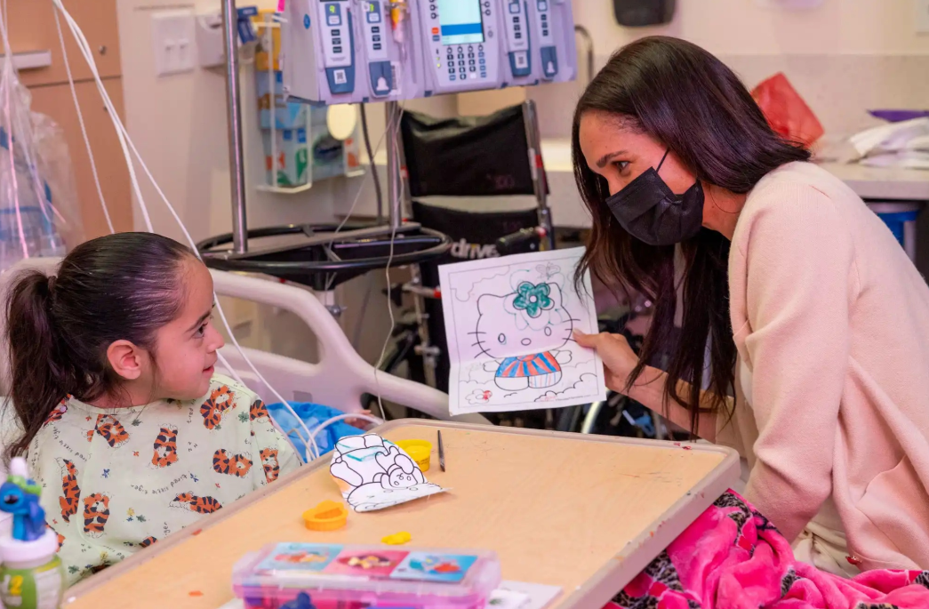 到了另外一个病房,梅根还陪着小女孩儿画画,她手里拿着一幅画,画上的小猫咪十分可爱;看她母爱满满的样子,不得不说哈里能与她组成家庭,就是因为哈里从小缺少母爱。