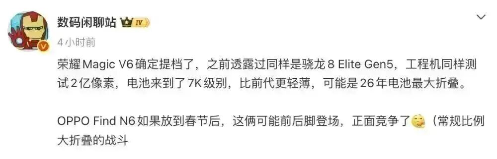 除此之外,博主@数码闲聊站 近日的一份爆料中提到,荣耀Magic V6是骁龙8 Elite Gen5,工程机测试过2亿像素,电池来到了7000mAh级别,比前代更轻薄,可能是26年电池最大折叠。