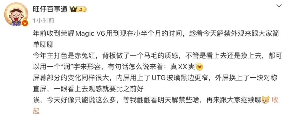 据博主@旺仔百事通 发文透露,荣耀 Magic V6 今年主打色是赤兔红,背板做了马毛的质感,手感和观感都可以用“润”字来形容。