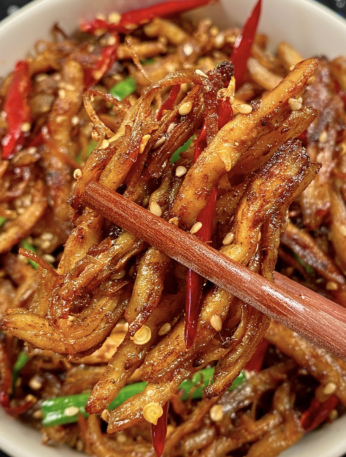 锅里倒油,别抠门,没过鸡丝一半的量就行,油温五成热扔一根葱进去,周围冒小泡泡就说明到位。把鸡丝分批下锅,中火慢炸,用铲子轻轻推,让它受热均匀。第一次炸大概三分钟,鸡丝从软趴趴变得金黄微卷,先捞出来歇口气。升高油温到七成热,全部倒进去复炸三十秒,逼出多余油脂,同时让表面脆到发光,“咔嚓”一声,隔壁小孩开始拍门。趁热把鸡丝倒进提前调好的辣椒碗里,像给它们做SPA,翻拌、按压、再翻拌,每一根都裹满红亮亮的麻辣铠甲,芝麻粘得满满当当,光看图就能流口水!