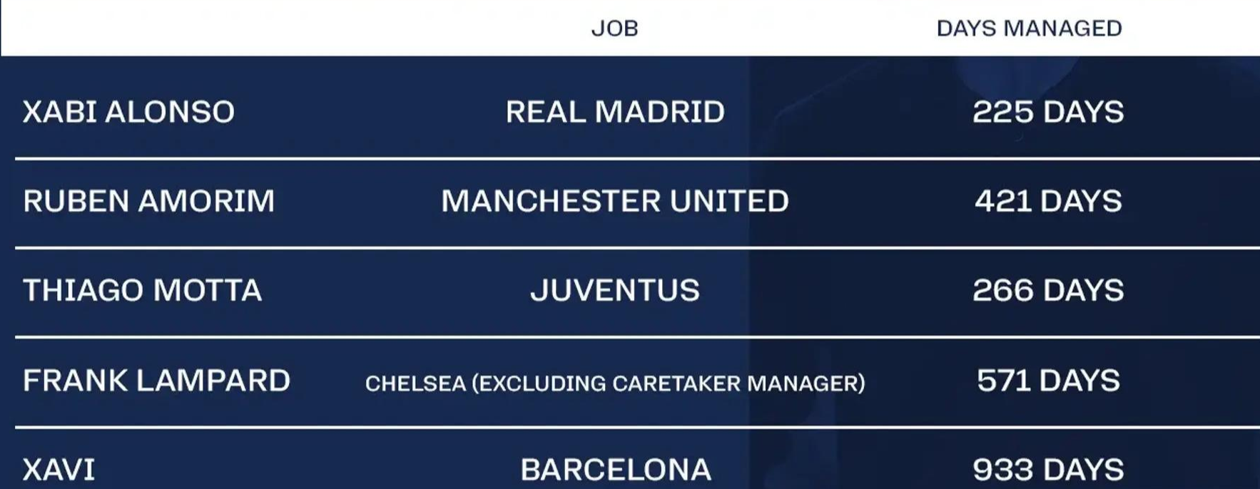 哈维·阿隆索(皇家马德里):顶着带领勒沃库森不败夺冠的光环入主伯纳乌,胜率其实不俗(34场24胜),但只因一座西班牙超级杯的失利,便迅速在2026年初被解雇。皇马更衣室被曝对其复杂的战术灌输感到“信息过载”,认为训练“强度过大”,球星们的不买账最终导致了这场短暂的联姻。