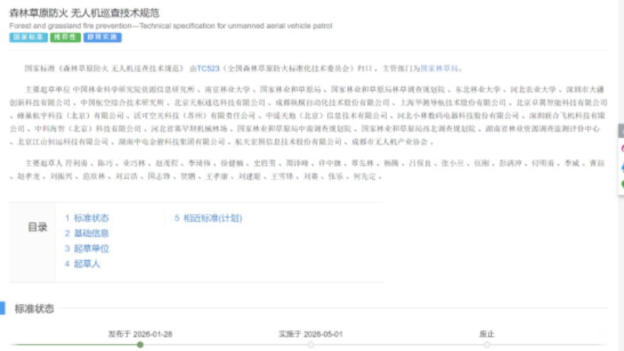 2026年3月,国家标准化管理委员会发布2026年第4号公告,由中国林业科学研究院牵头编制的国家标准《森林草原防火无人机巡查技术规范》(GB/T 47054—2026)正式获批发布,并将于2026年5月1日起正式实施。