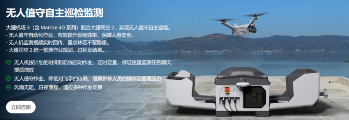 作为全球民用无人机及影像技术领导者,大疆创新不仅是消费级市场的霸主,更在林业防火应用领域深耕多年。据其官网介绍,大疆提供了从便携式红外无人机到无人值守自主巡检系统的完整解决方案。便携式红外无人机防火监测方案即通过使用小巧便携的 DJI Matrice 4T 无人机,搭配高性能可见光及热成像相机,对林区进行全局防火监测,发现起火点之后迅速进行现场火情侦察与定位。其大疆机场配合 Matrice 系列无人机,可实现自动巡航、热成像识别、实时回传、全天候作业,大幅提升巡查效率和预警能力。