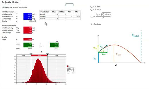 对于大多数专业人士来说,弹体运动轨迹的预测可能并不是日常计算的一部分,但在军工装备测试、航天器发射或工业机械安全评估中,它是一个必须定期分析的关键因素。借助@RISK软件,用户能够迅速模拟数千次弹道发射,从而生成其弹道可能飞行距离的概率分布,以确定安全区域。该模型可根据您的需求复杂或简单,无论是室内固定机器还是在有风天气从移动发射台发射的火箭,都能适用。