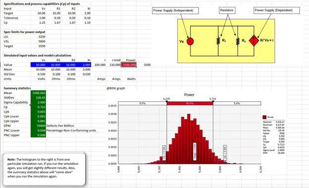 六西格玛是一种质量改进方法,许多行业使用它来减少产品或流程中的缺陷。@RISK 可用于分析六西格玛质量评估中常用的关键统计数据,包括:• 过程能力• 每百万件缺陷数• 不合格产品百分比有一个特别有用的功能是RiskOutput菜单,它允许分析师为产品定义规格限制。此示例展示了一个功率范围为5500瓦(W),正负300瓦的电气电路的六西格玛分析: