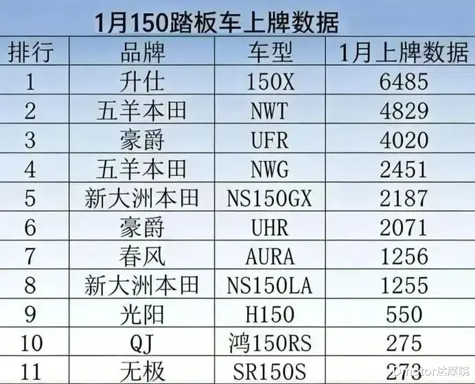 网红踏板升仕150X登顶本文跨度有点大,上面提到的内销和出口这两个观点其实很多朋友都知道,所以就不详细聊了。刚好今天,备受关注的150cc踏板1月份上牌数据曝光,看看农历新年前的这波销量前5名的踏板车有哪些。