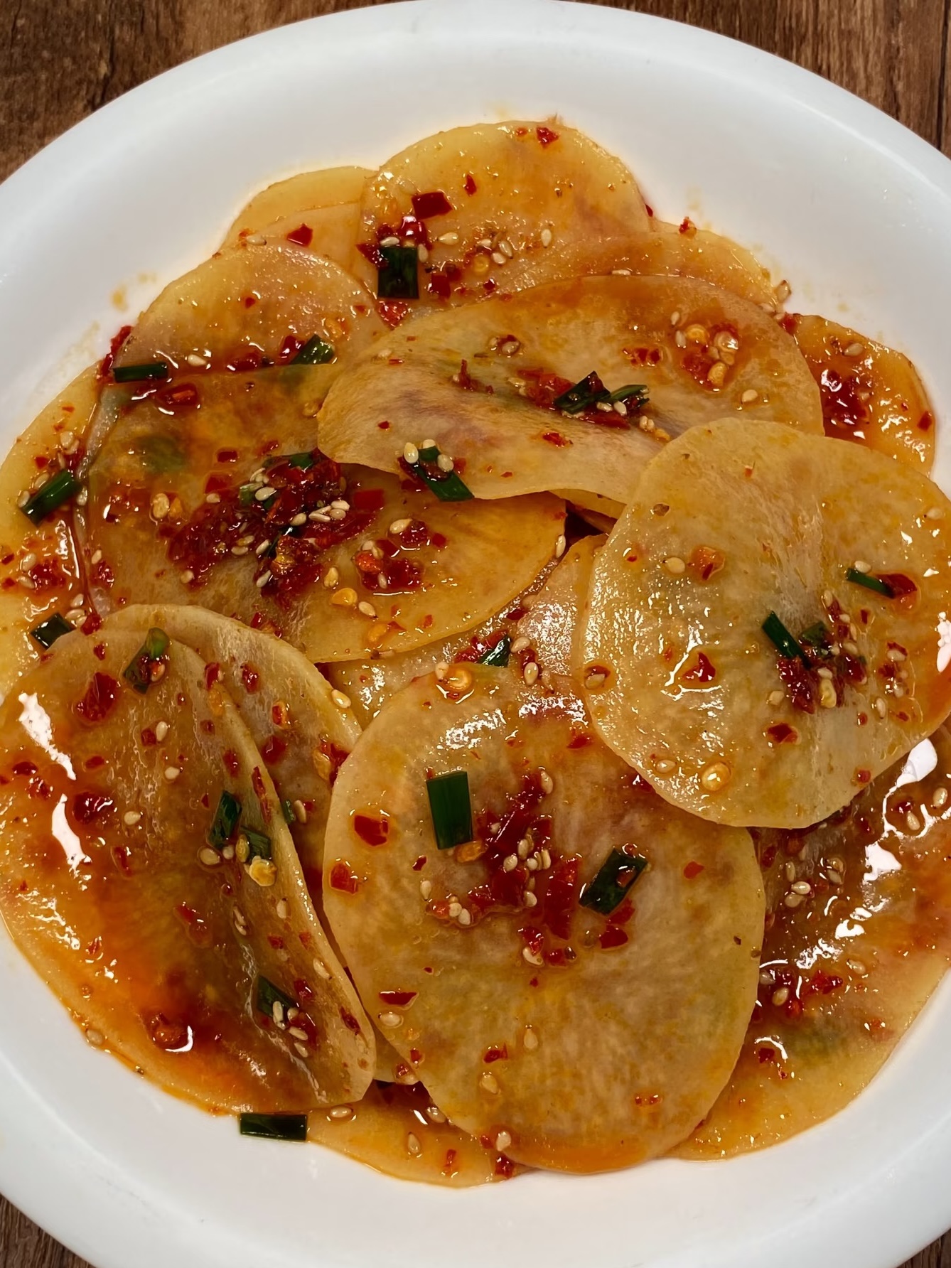 拌是“仪式感巅峰”。把沥干的土豆片倒进大盆,最好戴一次性手套,左手浇汁右手翻拌,让每片土豆都裹上红油花。动作要轻,不然薄得像纸的土豆会“骨折”。拌好后静置五分钟,味道才能渗透,表面看似平静,实则辣味正往芯子里钻。撒一把新鲜香菜或荆芥,绿色瞬间让整盆菜“长出森林”,颜值直接拉满。