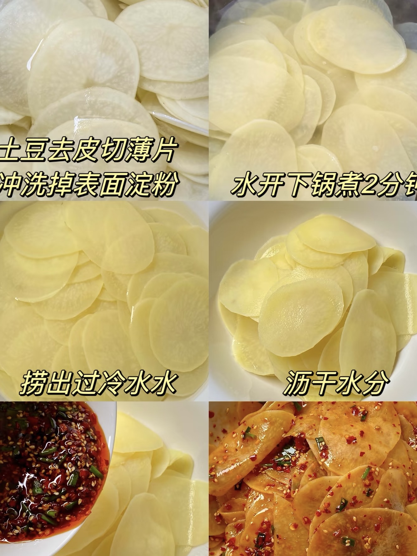 选土豆先看“肤色”。菜摊挑表皮光滑、无绿芽、捏着硬邦邦的“黄心小哥”,淀粉适中,口感才脆。买两个就能拌一大盆,成本不到五块钱,比一包辣条还便宜。回家去皮,用刀切成1毫米厚的“透明硬币”,别偷懒用擦片器,手切才有灵魂,厚薄不均反而让口感更立体。切完立刻泡进水盆,反复淘洗三遍,把表面淀粉洗到水变清,这样土豆才能从“黏人精”变身“清爽崽”,后面煮多久都不糊汤。