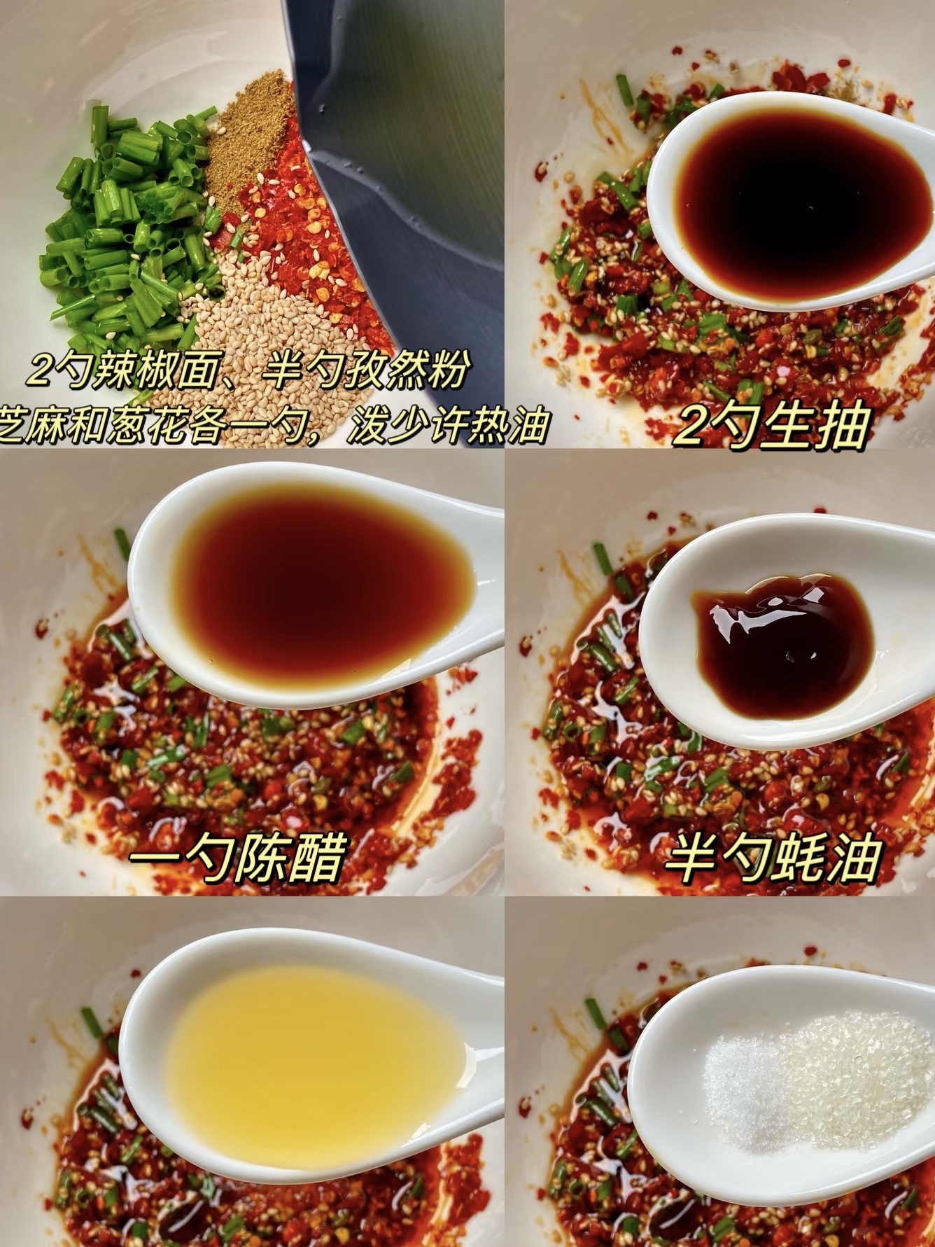 料汁是“灵魂蹦迪”。碗里放两勺辣椒面(粗细各一半,香+辣双杀),半勺孜然粉提烧烤味,一勺白芝麻增香,一勺葱花负责清爽。锅里烧热两勺油,油面微微冒青烟时“哗”地泼进碗里,香料瞬间被热油吻醒,噼里啪啦像小烟花。接着加两勺生抽撑咸鲜,两勺陈醋吊酸爽,半勺蚝油提厚味,半勺糖中和辣,最后用半勺凉白开稀释,搅匀到糖粒失踪,酱汁像“红糖玛瑙”,亮到能照镜子。