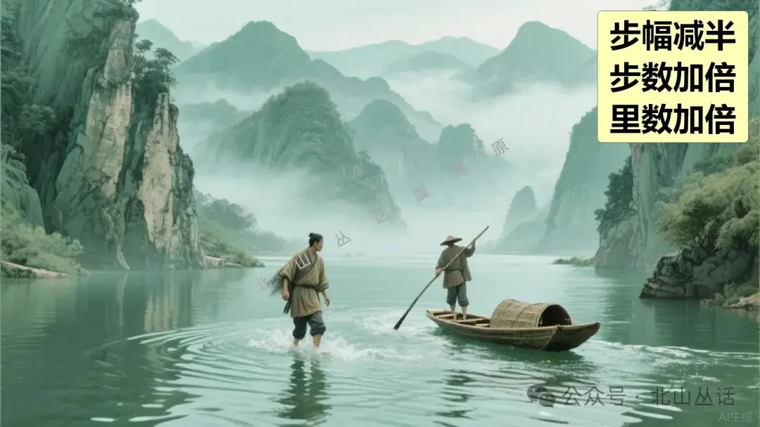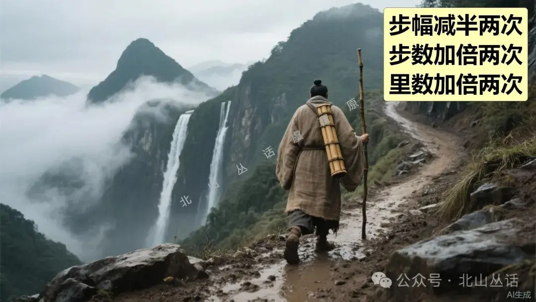 古代的山路是羊肠小道,很多地方崎岖难行,水路则要徒步涉水或驾舟。对于山路和河流,步幅必然减半,对应的步数和里数要予以加倍来修正,也就是双倍。