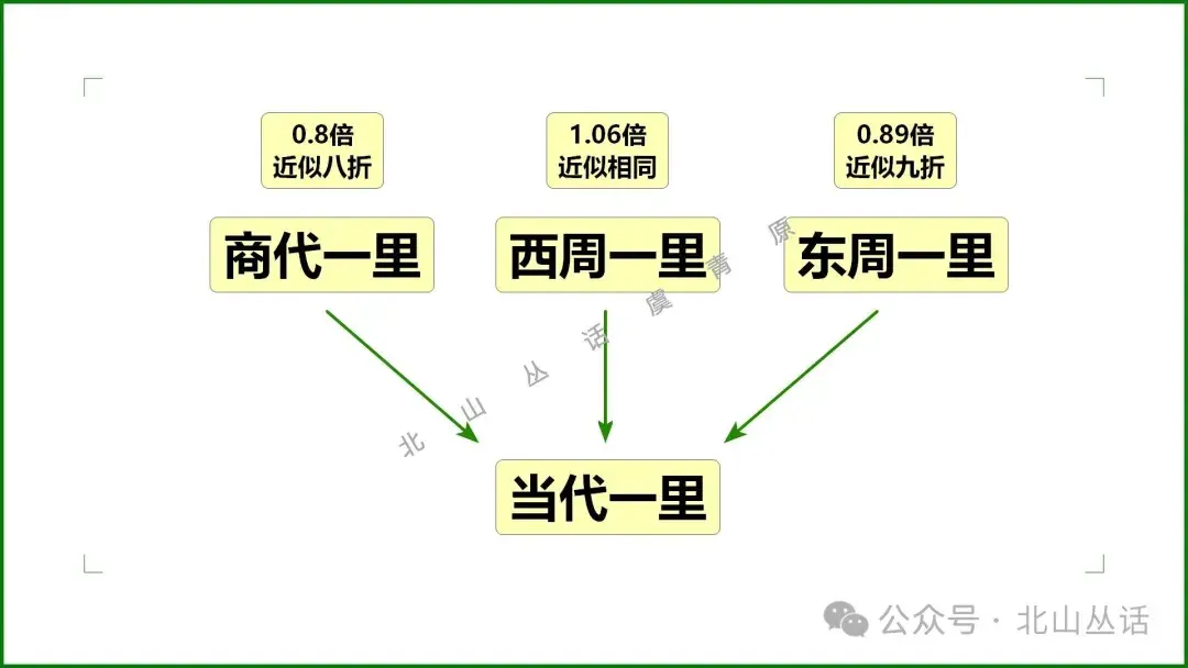 商代一里的长度大约为我们当代一里的0.8倍,近似八折。西周一里的长度为我们当代一里的1.06倍,两者近似相同;东周一里的长度为我们当代一里的0.89倍,近似九折。