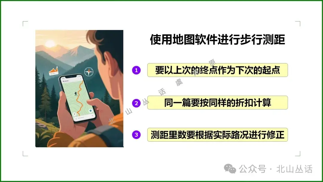 使用地图软件进行步行测距,要以上次的终点作为下次的起点,同一篇要按同样的折扣计算,测距里数要根据实际路况进行修正。