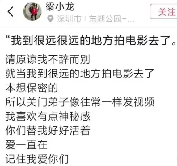 1月18日晚,梁小龙社交媒体账号发布的这封告别信,