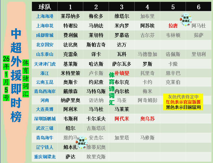 新年伊始,中超各队也都在进行着新赛季的备战工作,其中外援的调整成为球队在2026赛季取得好成绩的关键,截止今天上午,中超16队续约留用外援、官宣新外援、传闻外援情况汇总如下。