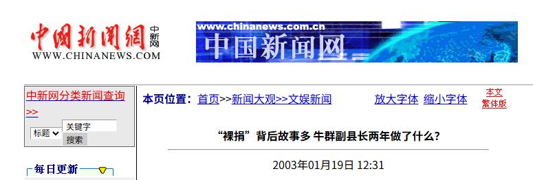 中国新闻网 2003-01-19——“裸捐”背后故事多 牛群副县长两年做了什么?