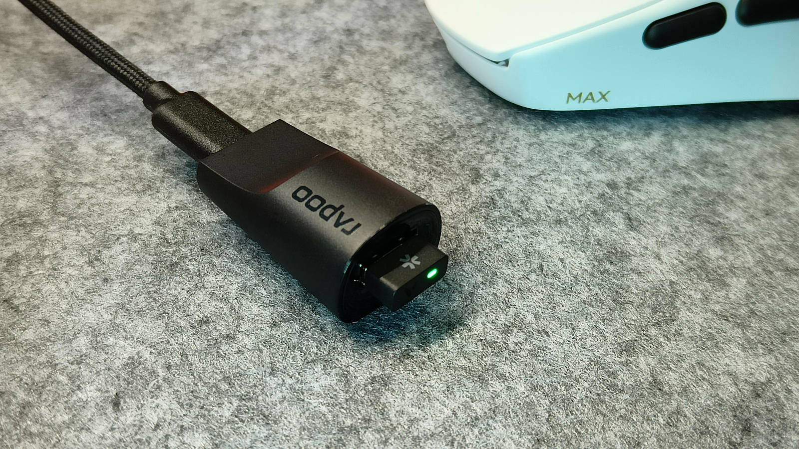 配套的Nano 8K接收器不仅保证了极致的传输性能,更集成了RGB电量提示灯。用户无需依赖驱动软件,仅凭RGB指示灯颜色,就能直观判断鼠标剩余电量,方便及时给鼠标充电。