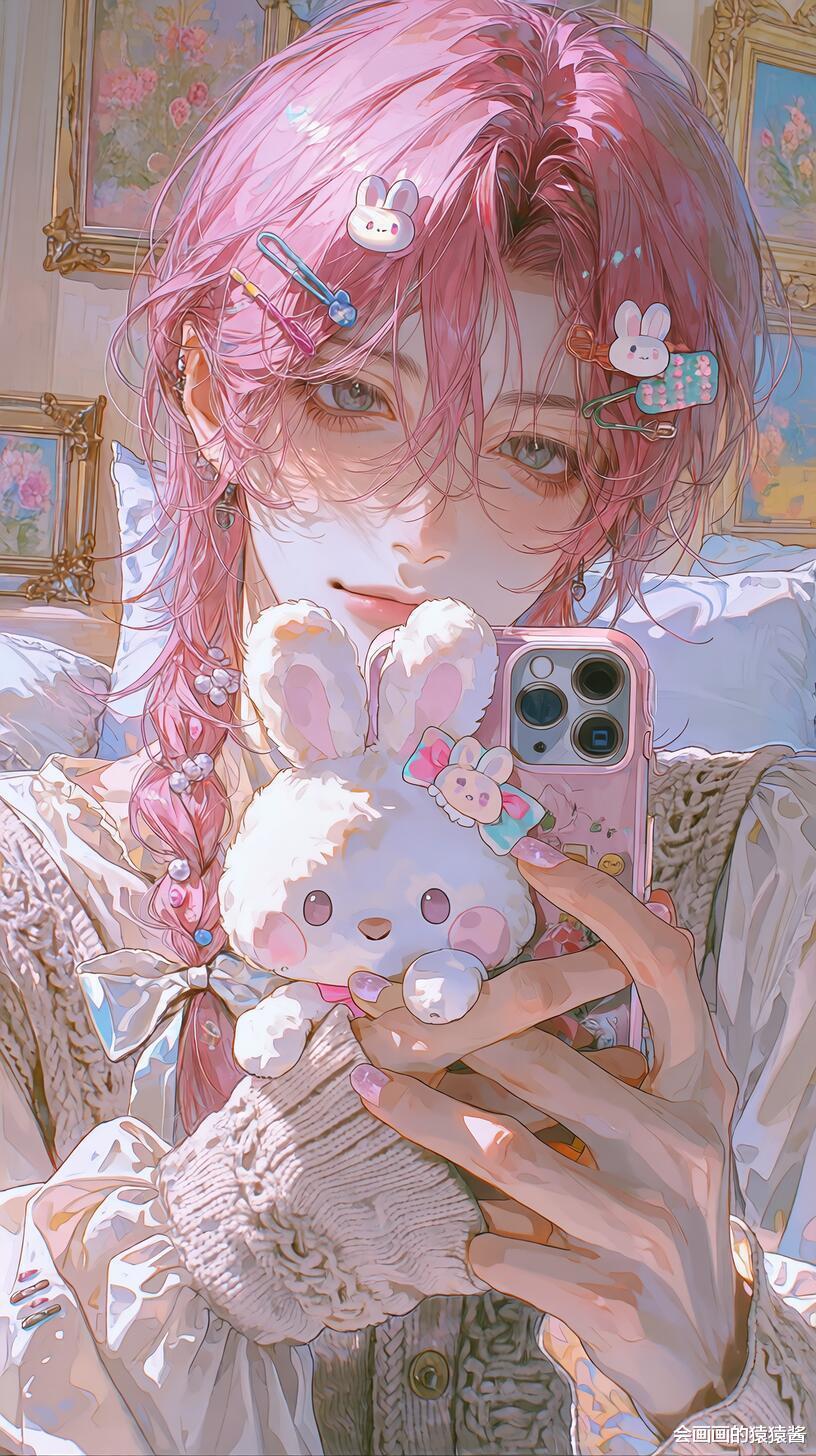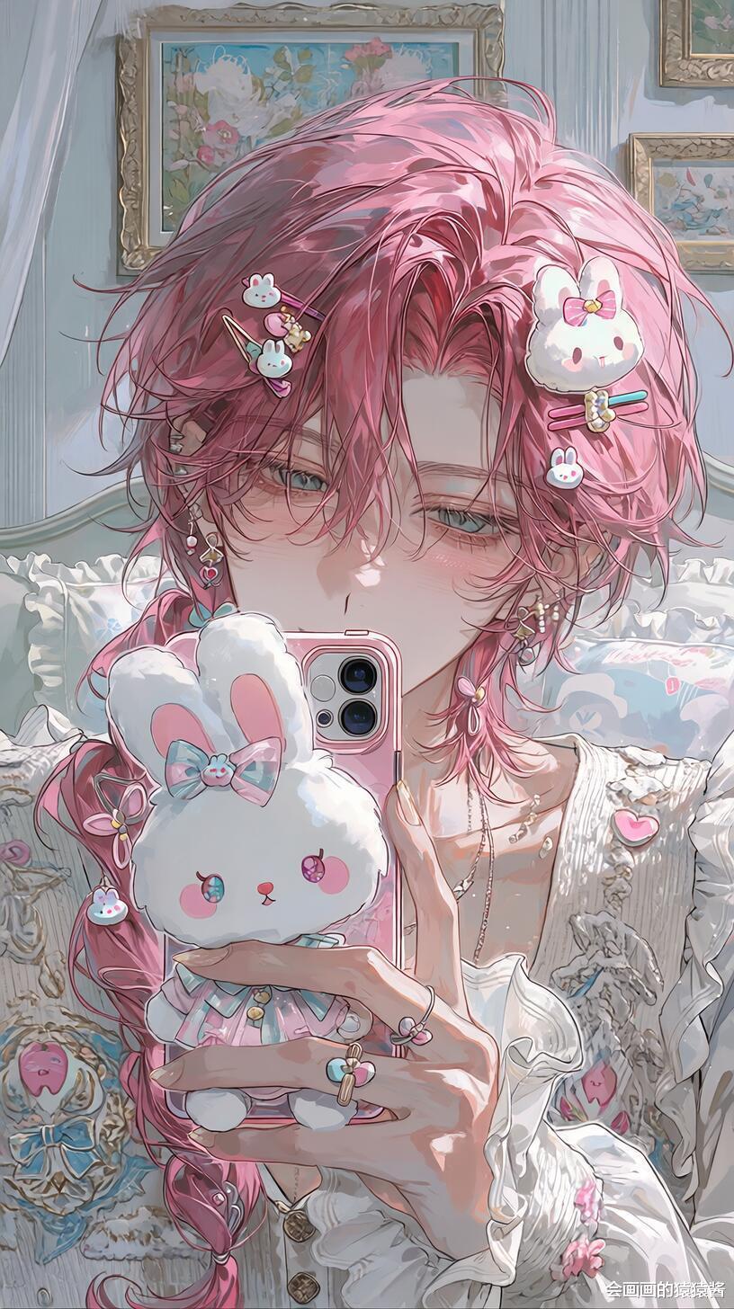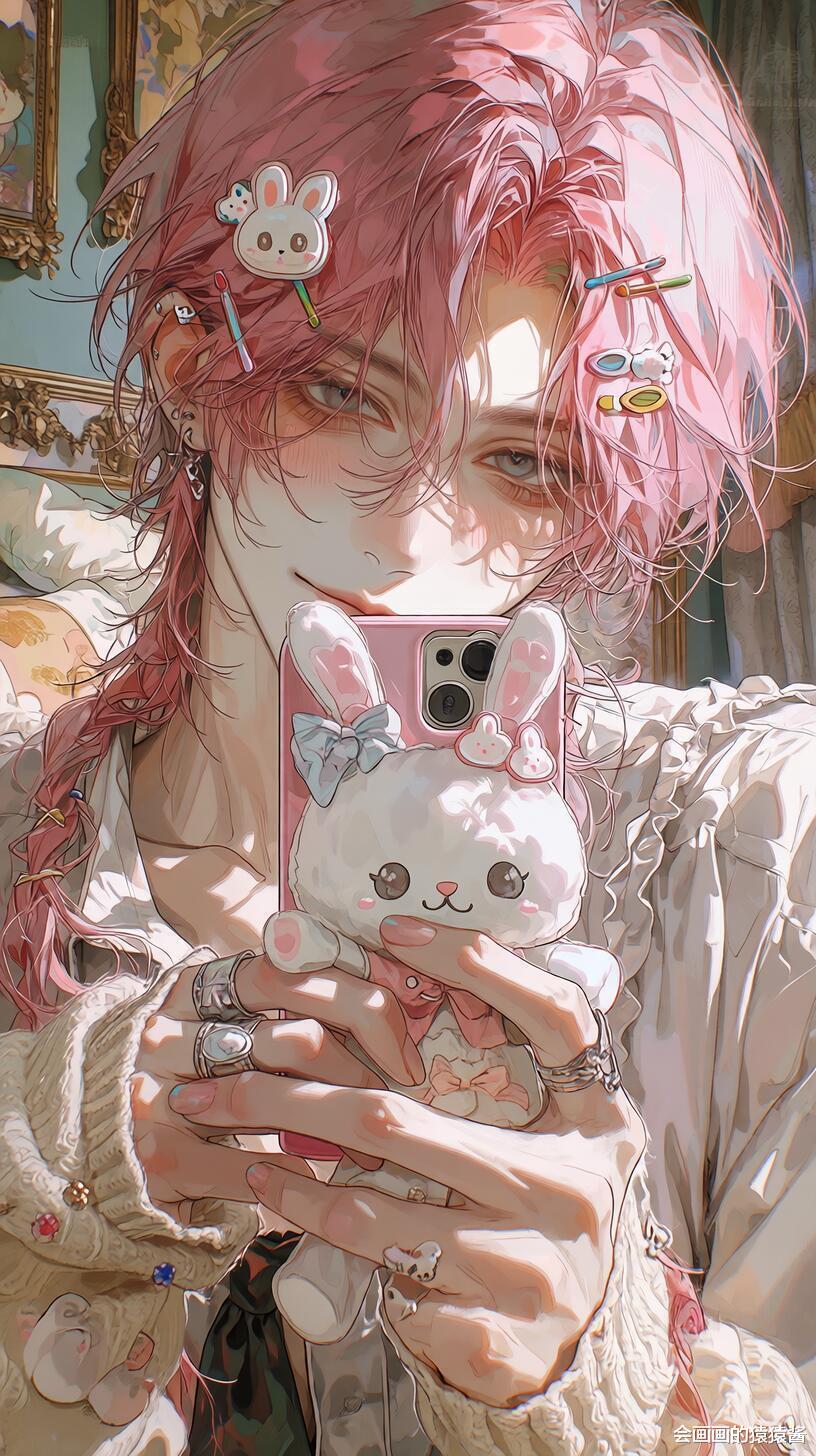 (9:16 竖版构图),美少年,粉紫色渐变长发,发丝如丝绸般顺滑,头戴 Hello Kitty 蝴蝶结发饰,蕾丝衬衫,珍珠项链,指尖戴心形戒指,手持镶钻兔子手机壳,眼尾微红显慵懒,背景是复古油画质感,柔和光影,细腻笔触,高清 8K,氛围感拉满。