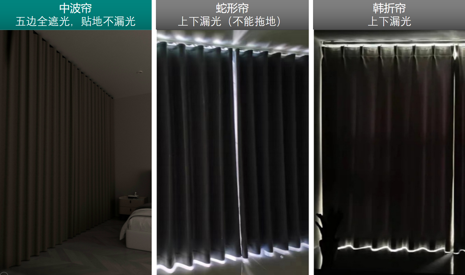 中波帘最核心的优势,就是把传统窗帘的五大漏光死角全堵死了: