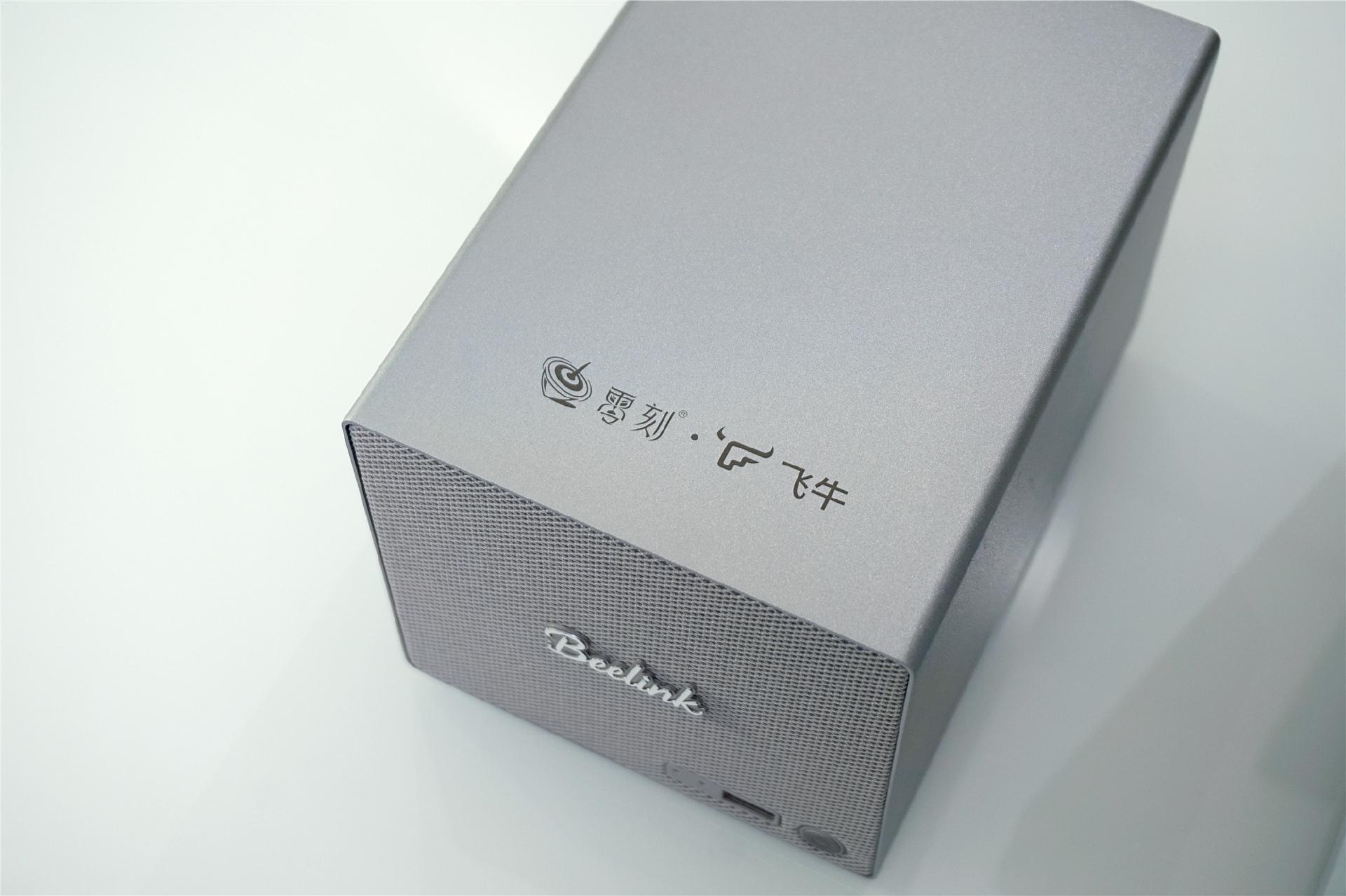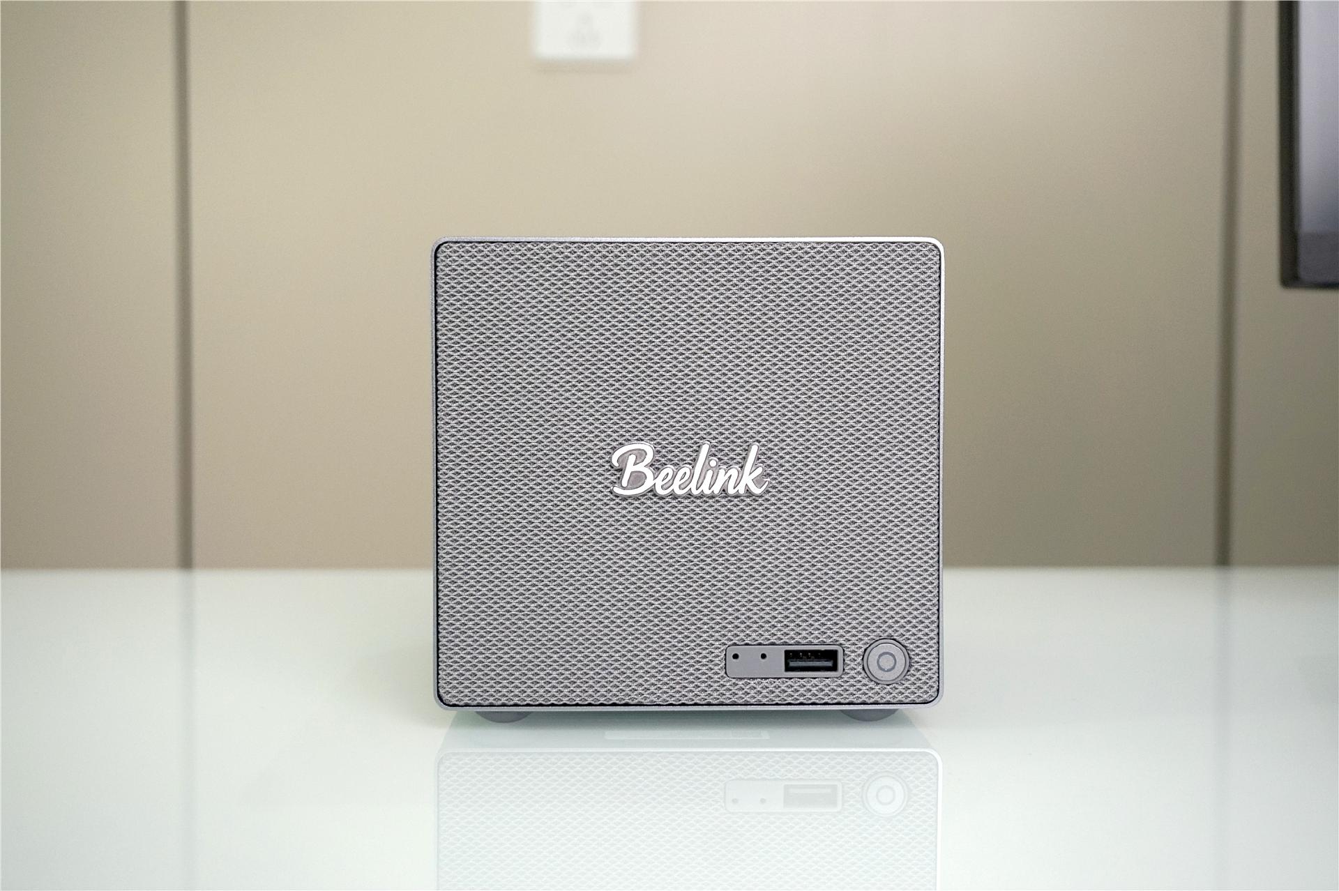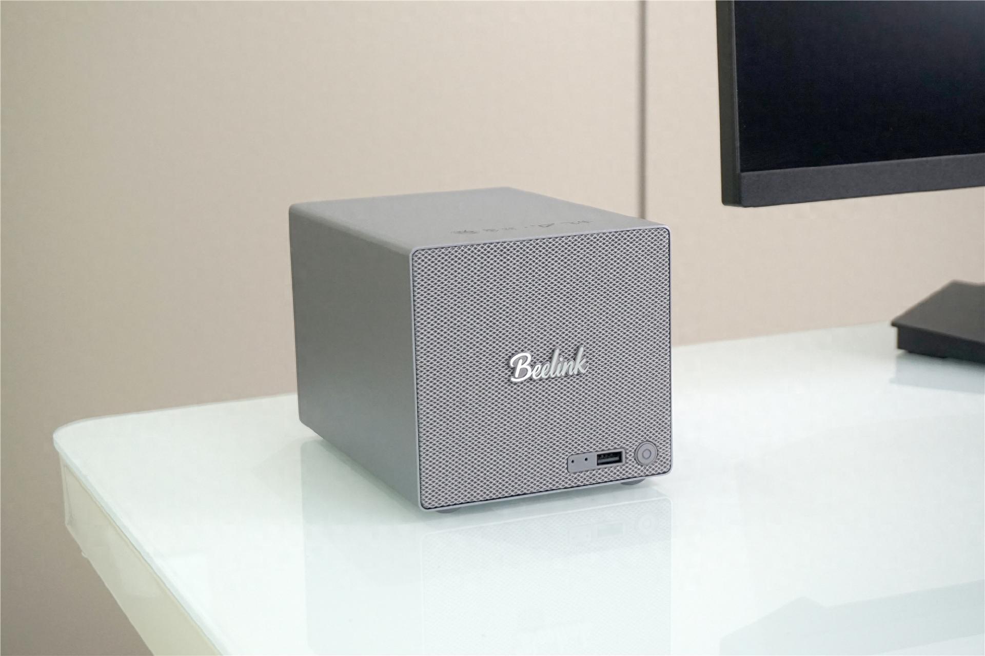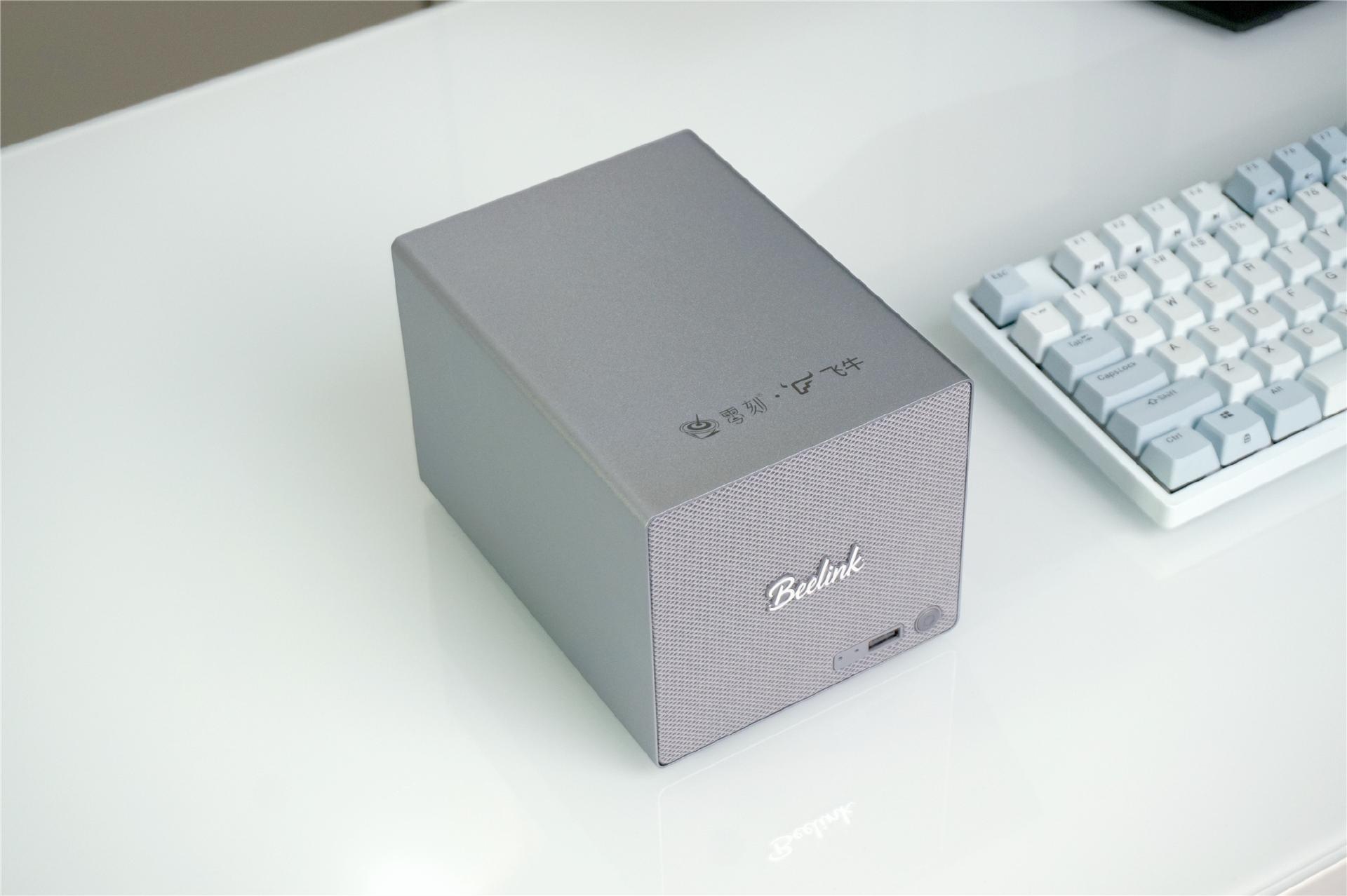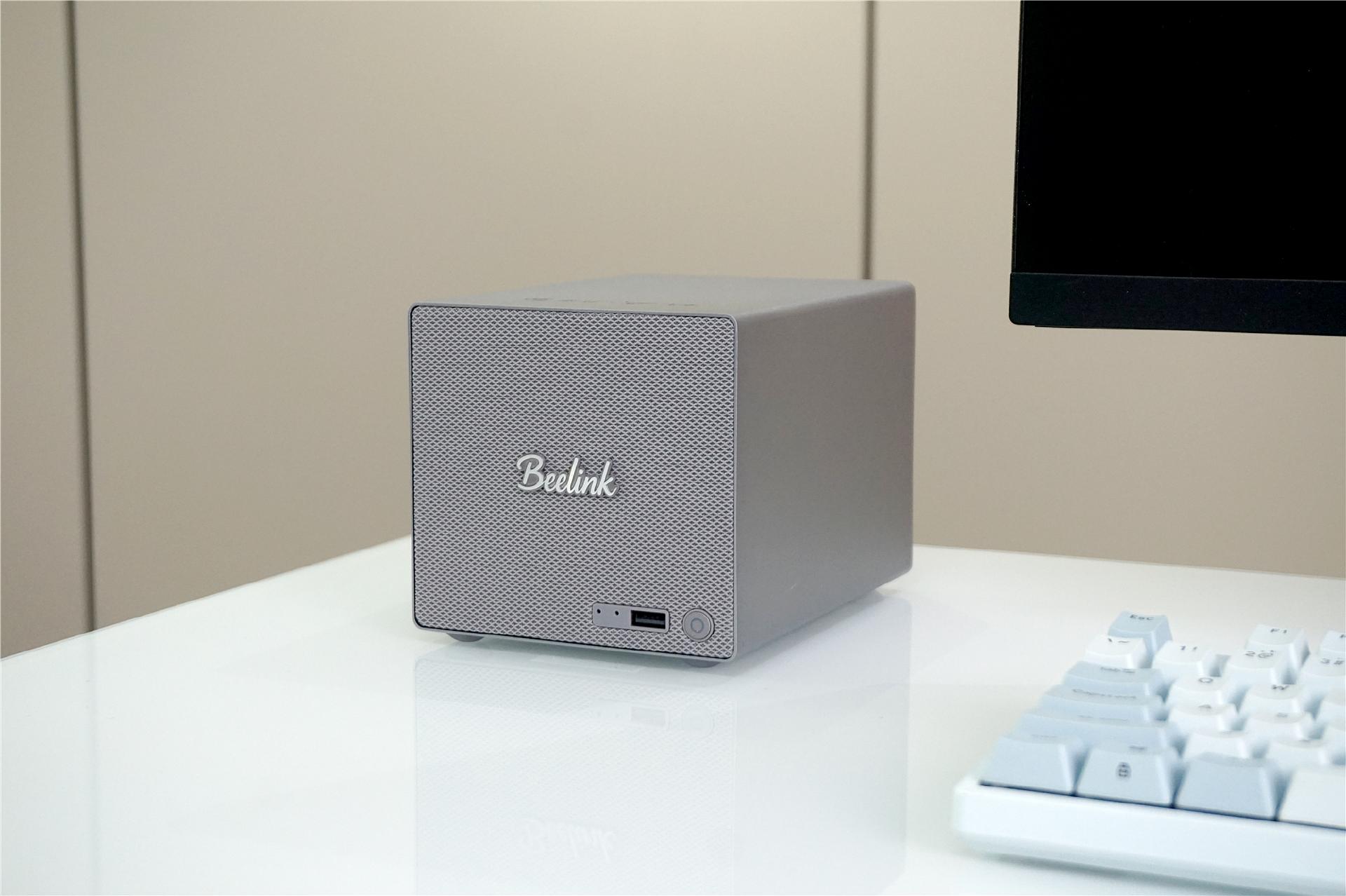 正面的灰色编织网布搭配Beelink Logo,摆脱了传统NAS的工业风,放在书房、客厅都不违和,真的是越看越喜欢。而且小巧的机身,令桌面瞬间腾出了不少空间。