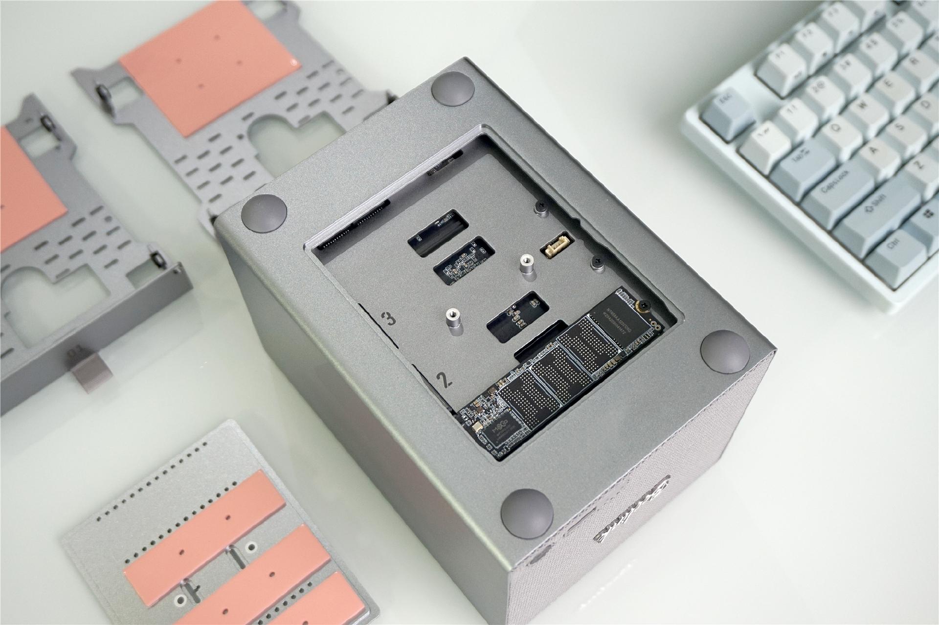 另外,静音的同时,散热一点没拉胯。它的散热体系做得很完善,不只是靠风扇,硬盘支架那里还提前贴好了导热垫。把硬盘装上去后,热量能通过导热垫传到硬盘支架那里,再导到机身散出去,根本不用给硬盘单独装风扇。这样一来,不仅散热高效,机身体积也能做得更小巧,不占地方,这套散热和静音的搭配真的太懂用户了。