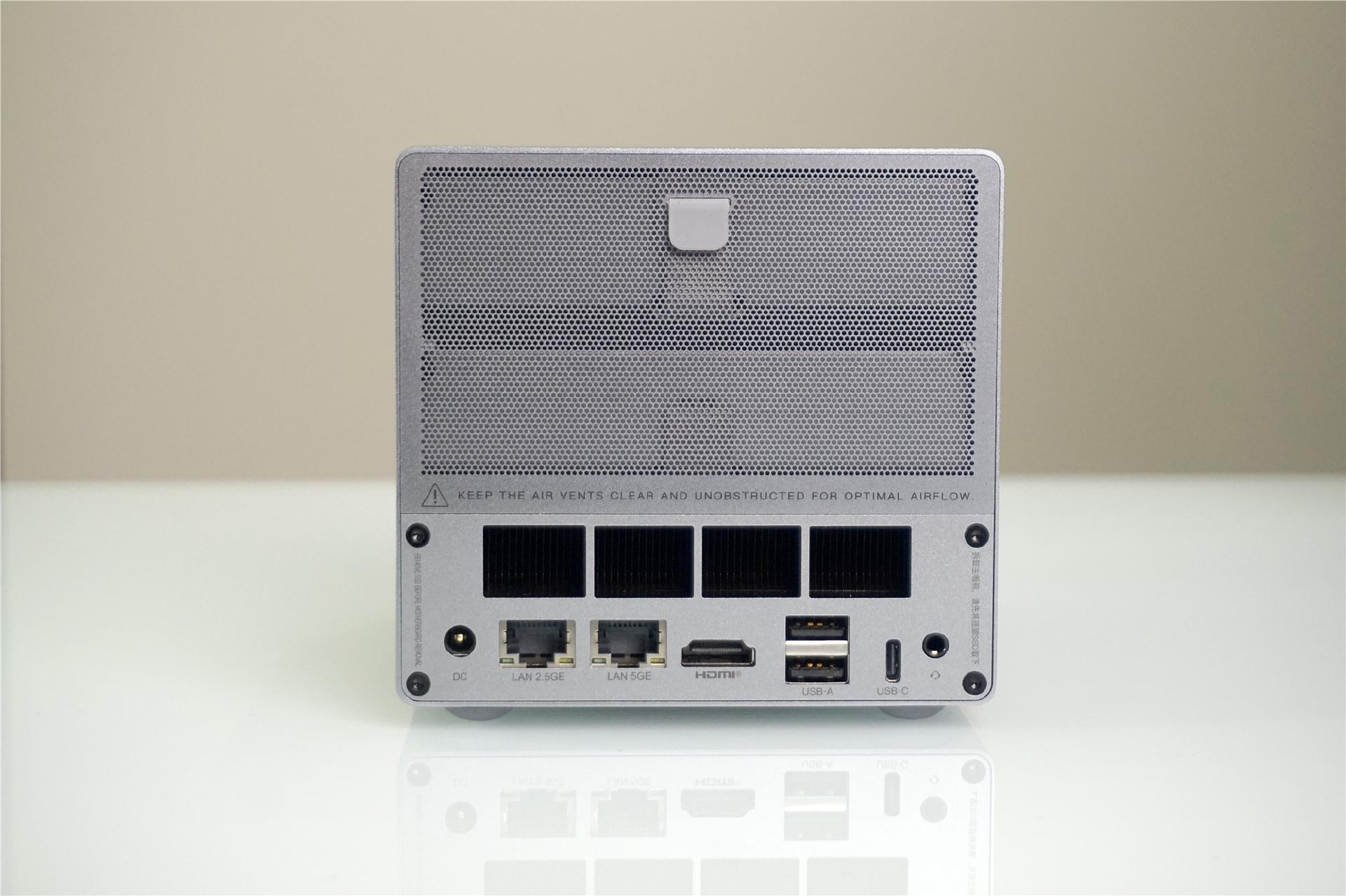 机身背面的接口更齐全,5GbE+2.5GbE双网口、HDMI、两个USB、10Gbps Type-C(支持视频输出)和3.5mm音频口,不管是接电视看电影,还是连键盘鼠标当小主机用,都能满足。如果大家使用过零刻的设备就会知道,零刻在接口配备方面,从来都是能设计多少就设计多少,把空间利用到极致。