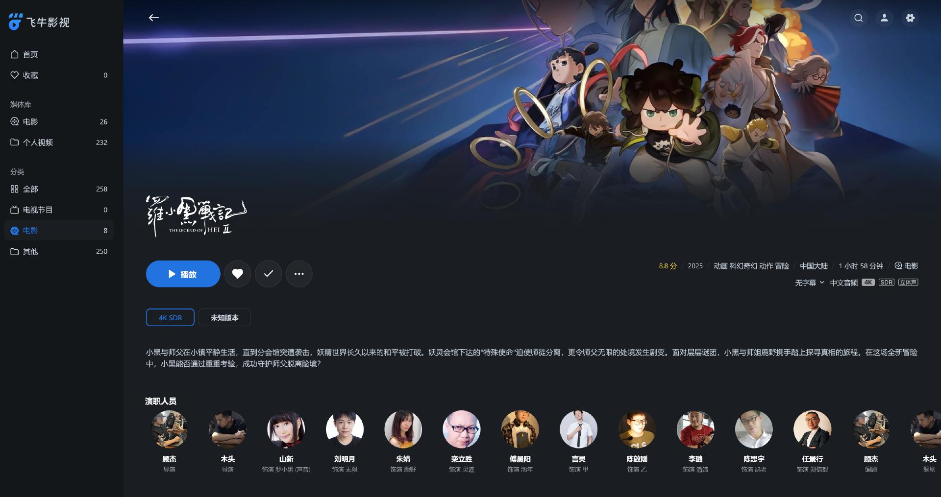 以前存的电影乱糟糟,找片全靠记文件名,现在系统会自动匹配海报、导演、演员信息,还能同步豆瓣评分和剧情简介,生成的海报墙整齐又美观,看着就像专业的影音播放器。