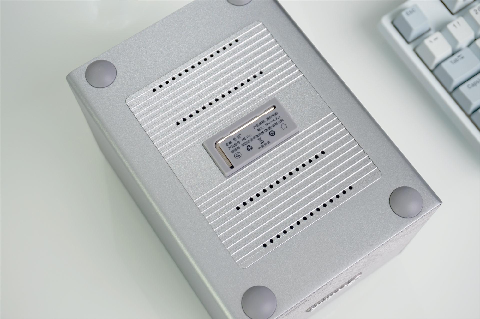 再来看看零刻ME Pro的正面。第一眼真的以为它是一个复古音箱,非常契合现代人的审美。另外,其正面还配备了一个10Gbps的USB-A接口,平时插移动硬盘传文件很方便,不用绕到机身后面。